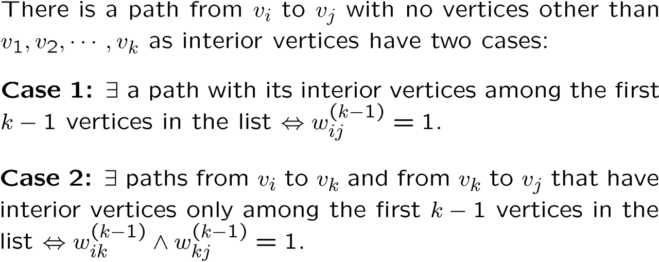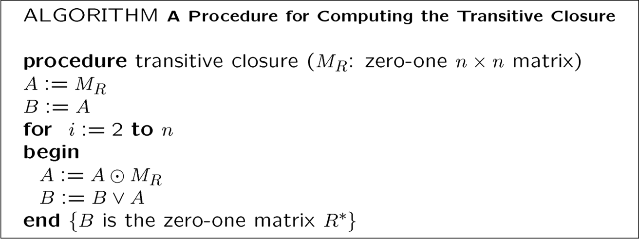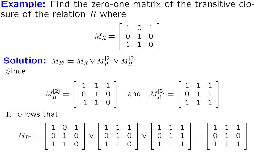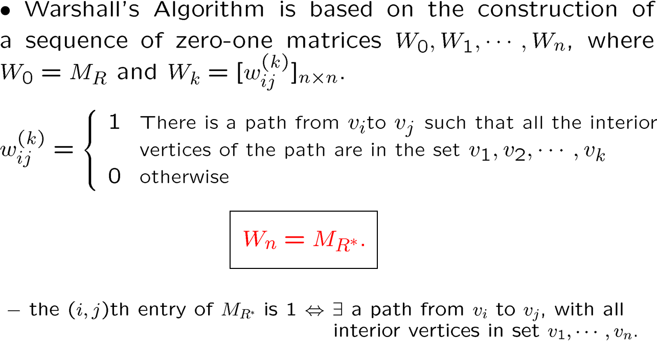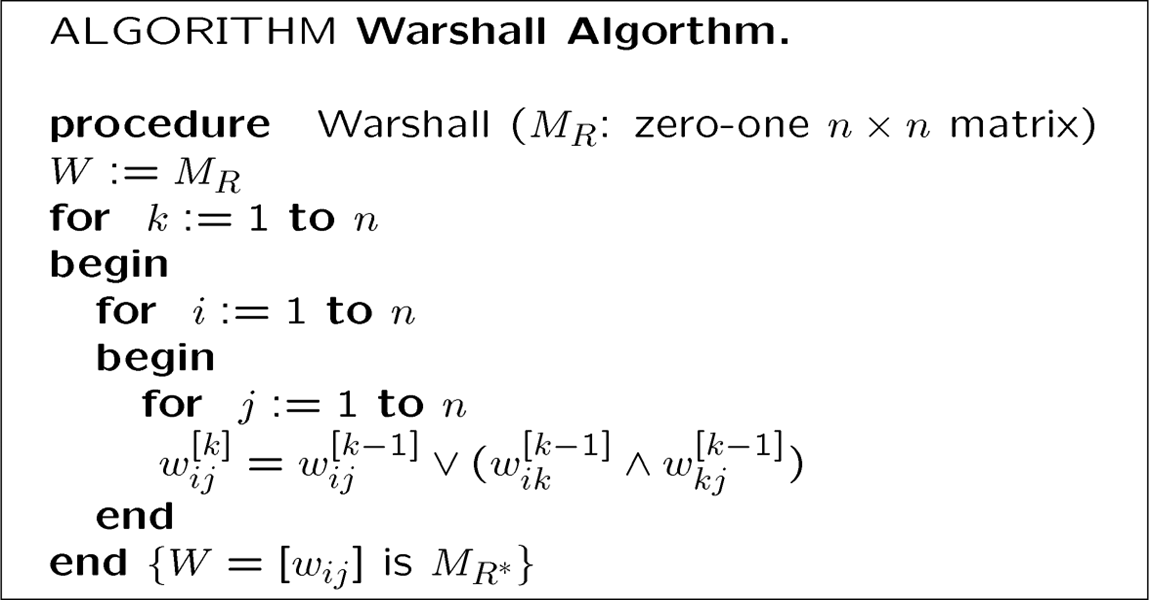 - 令 \(M_R\) 是表示 \(R\) 的 0-1 矩阵,则 \(M_{R^*}=M_R\lor M_R^{[2]}\lor M_R^{[3]}\lor …\lor M_R^{[n]}\)