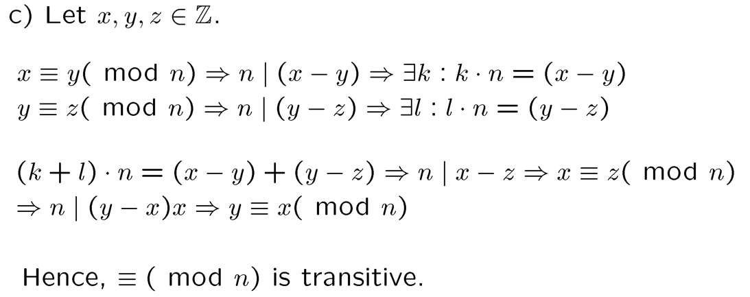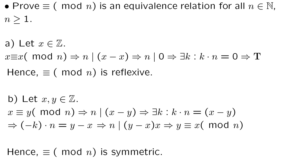 - 一个关系是等价关系,若它同时满足自反性、对称性、传递性