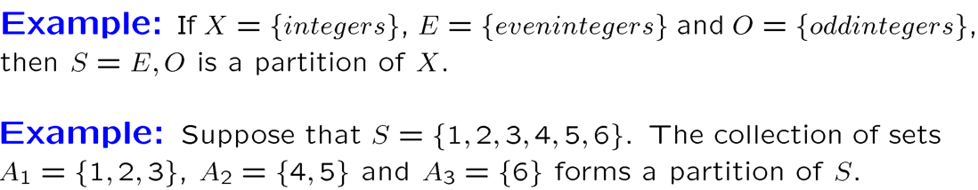 集合 \(S\) 上的划分 \(\pi\) 是 \(S\) 的一组子集 \(\set{A_1,A_2,…,A_n}\),并且满足: