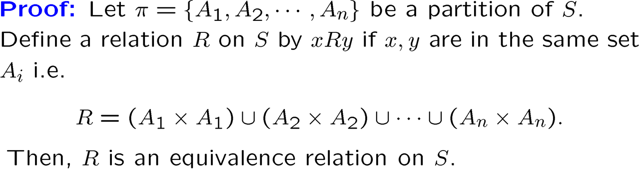 - 令 \(\set{A_i|i\in I}\) 为集合 \(S\) 的一组划分,则存在 \(S\) 上的等价关系 \(R\),使得每个 \(A_i\) 都是 \(R\) 的等价类