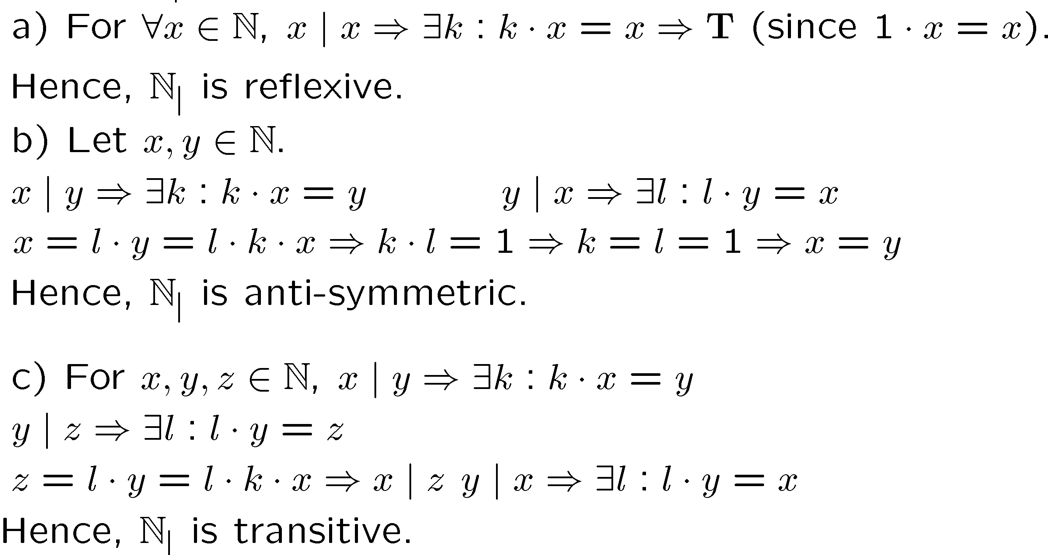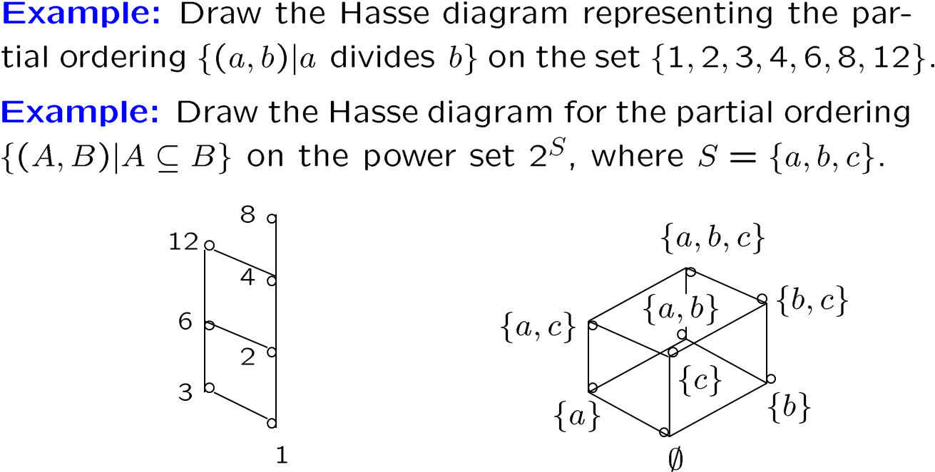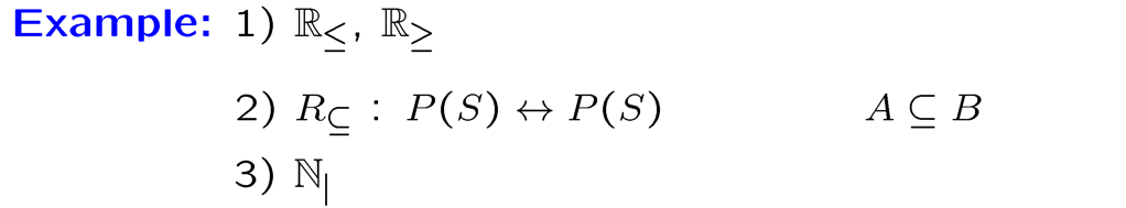 - 关系 \(R_\preceq :S\leftrightarrow S\) 称为偏序关系,如果它满足自反性、反对称性和传递性