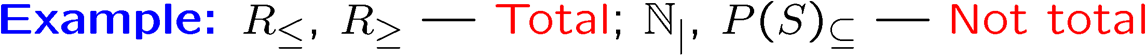 - 若偏序集 \((S,\preceq)\) 中任意两个元素都是可比的,则称 \(S\) 为全序集(Totally Ordered Set)或线性序集(Linearly Ordered Set)或链(Chain),关系 \(\preceq\) 称为全序(Total Order)或线性序(Linear Order)