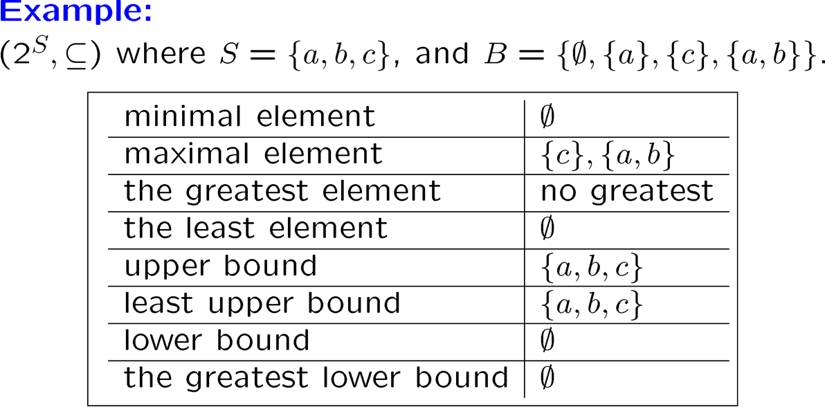 - \(a\) 是 \(B\) 的最大元(Greatest Element): \(a\in B\) 且对任意 \(x\in B\) 有 \(x\prec a\)