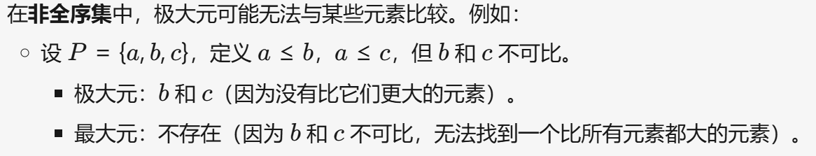 - 最大元是全局概念,表示 “该元素与其它元素都可比,且它比所有元素都大”,可能不存在,最多存在一个
