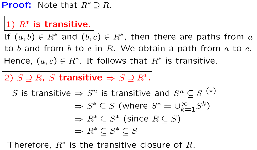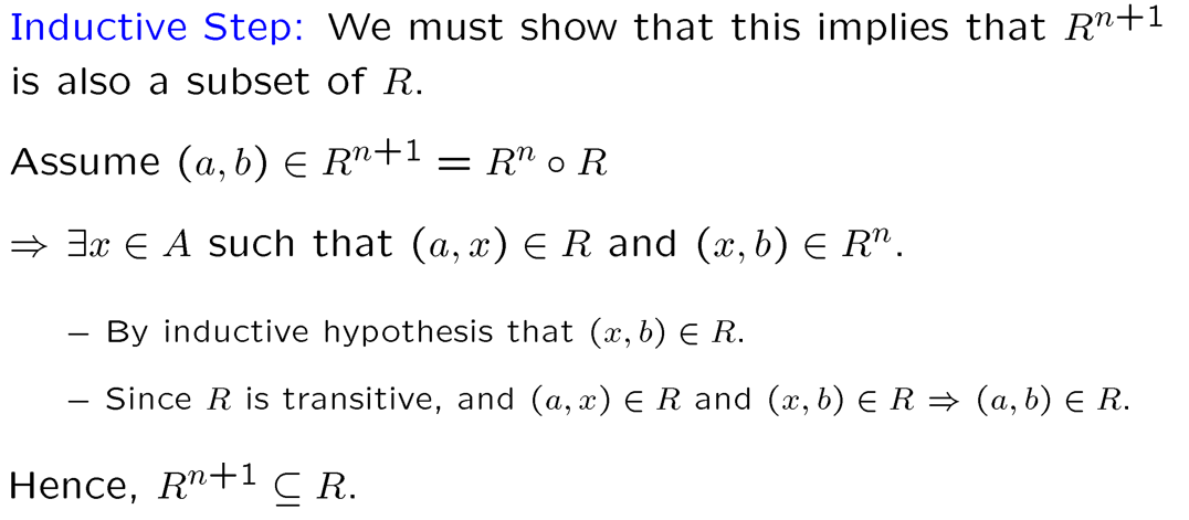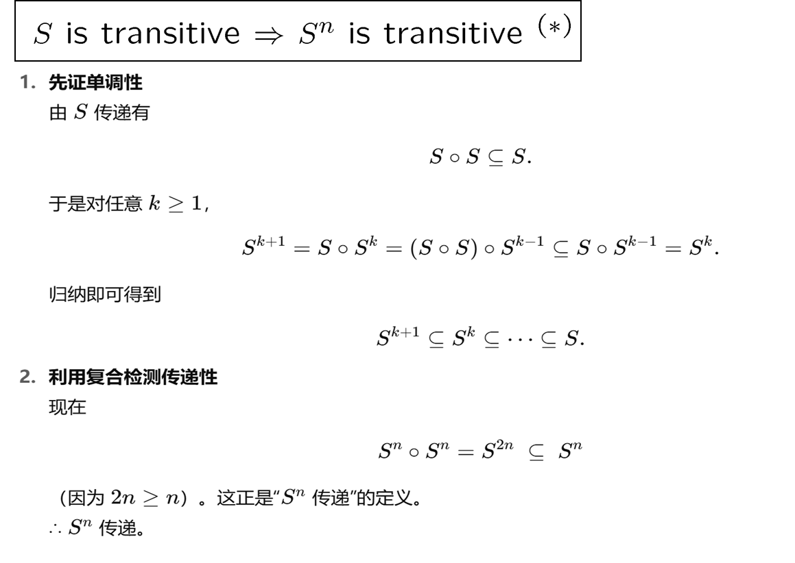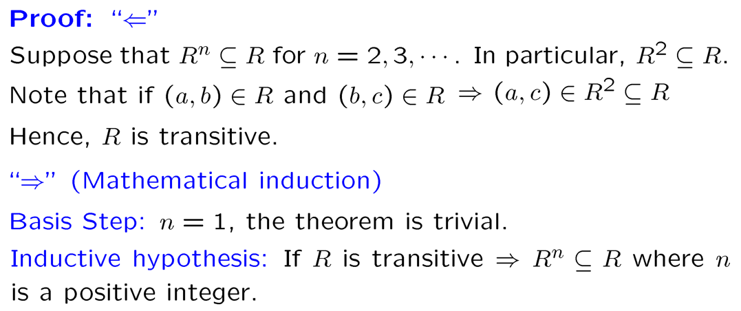 定理: \(R\) 具有传递性 \(\Leftrightarrow R^n\subseteq R\ for\ n=2,3,…\)