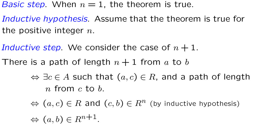 存在从 \(a\) 到 \(b\) ,长度为 \(n\) 的路径 \(\Leftrightarrow (a,b)\in R^n\)